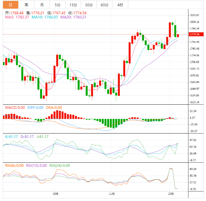 周二早盘,现货黄金震荡反弹,目前交投于1773.78美元/盎司附近;隔夜出炉的美国11月份ISM非制造业PMI数据表现强于预期,帮助美元从逾五个月低点大幅反弹,令金价从近五个月高点大幅回落,金价周一收跌1.62%,收报1668.59美元/盎司,为逾两个月最大单日跌幅,虽然短线超跌后存在反弹需求,但是后市看涨信号明显减弱。
