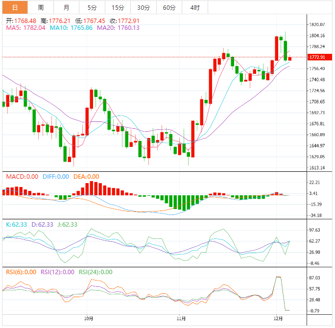 与此同时,如果跌破上述1765美元附近的支撑线,金价将毫不犹豫地朝着11月底1721美元左右的低点波动。