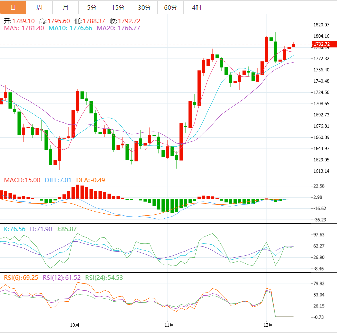 当前布林带即将开口,MA均线走出双金叉,KDJ随机指标三线向前,到达超买,MACD指标红色动能柱持续放量,快慢线金叉向上,综合来看,黄金目前短期或上行不足,日内操作建议等待跌至1775-1780附近做多,同时上方关注1795-1800附近阻力,不破也可进行先空后多。