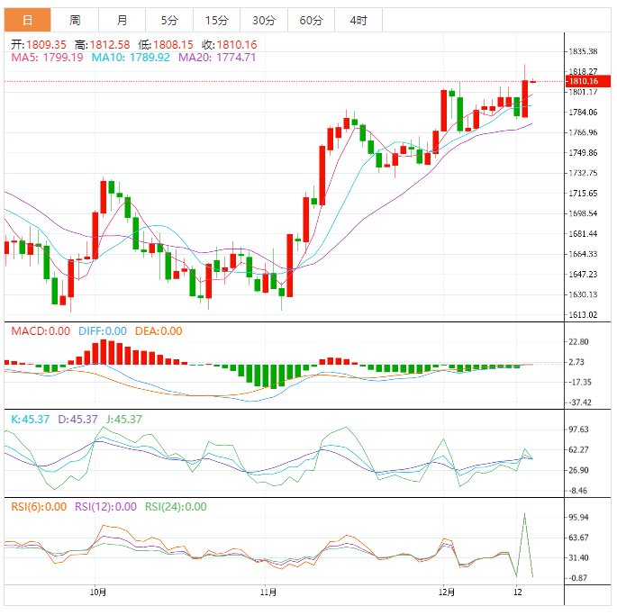 黄金价格在一周前的阻力线和11月15日的阻力线上升趋势线之间徘徊,分别接近1,805美元和1,820美元,因交易商等待美联储的决定。