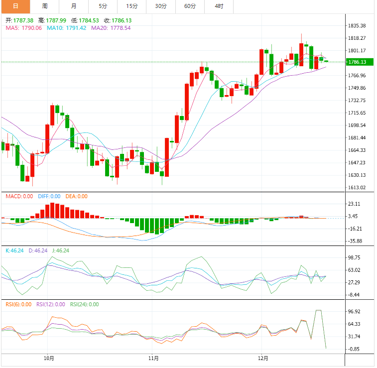周二盘中,黄金交投于1786.23附近。金价周一在淡静交投中下跌,利率上升的预期推动美债收益率走高,盖过了美元疲软的影响。现货金下跌0.2%,至每盎司1789.46美元。Kitco Metals高级分析师Jim Wyckoff说,“我们看到交投淡静,我们开始看到一些节前交易,在最近的央行数据之后,黄金和白银交易员正在寻找新的基本面消息。”美国国债收益率在周一上涨,美元有所回落。Wyckoff补充说,一旦大型机构和基金开始进行一些新的买盘,价格可能会在年底前横盘整理到走高,黄金市场会出现一些早期的低吸买盘。