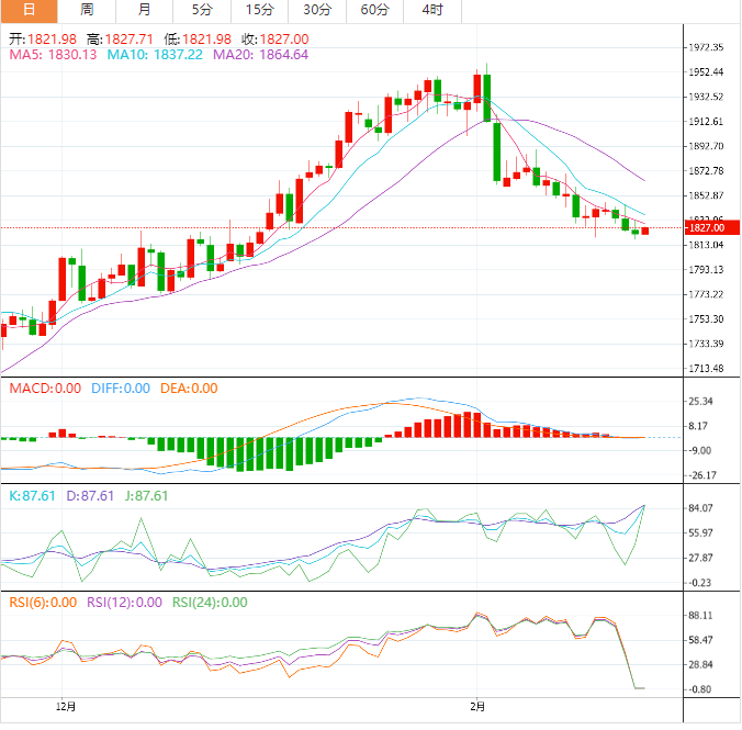 从黄金4小时图来看,黄金价格已经跌破1829.45美元/盎司(从去年11月3日低点1616.69美元/盎司到今年2月2日高点1959.71美元/盎司升势的38.2%斐波那契回撤位)。一旦跌破短期支撑位1819.00美元/盎司,预计金价将进一步走软。
