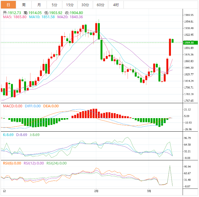 硅谷银行倒闭的影响仍笼罩市场,美国股市跌至近两个月低位,欧洲股市录得年内最大单日跌幅,给金价提供避险支撑。市场对美联储3月份暂停加息的预期升温,美债收益率和美元指数持续大跌,也给金价提供上涨动能。虽然短线涨幅较大,金价也存在小幅回调的需求,但预计在失守2月9日高点1890附近支撑前,金价后市仍有进一步冲高机会。