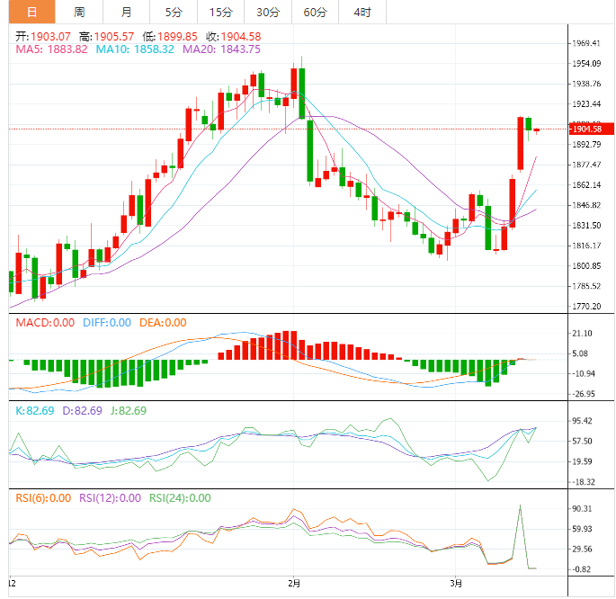 周三亚洲时段,黄金交投于1904.58附近。金价周二下跌,美债收益率攀升打击了黄金近期受美国银行业危机推动的涨势,而美国2月通胀上升给利率前景带来的问题多于答案。指标美国10年期国债收益率上升,让非孳息黄金的吸引力承压。黄金对美国消费者物价指数(CPI)数据的反应不大,该数据显示,在1月攀升0.5%后,CPI在2月环比上涨0.4%,符合预期。