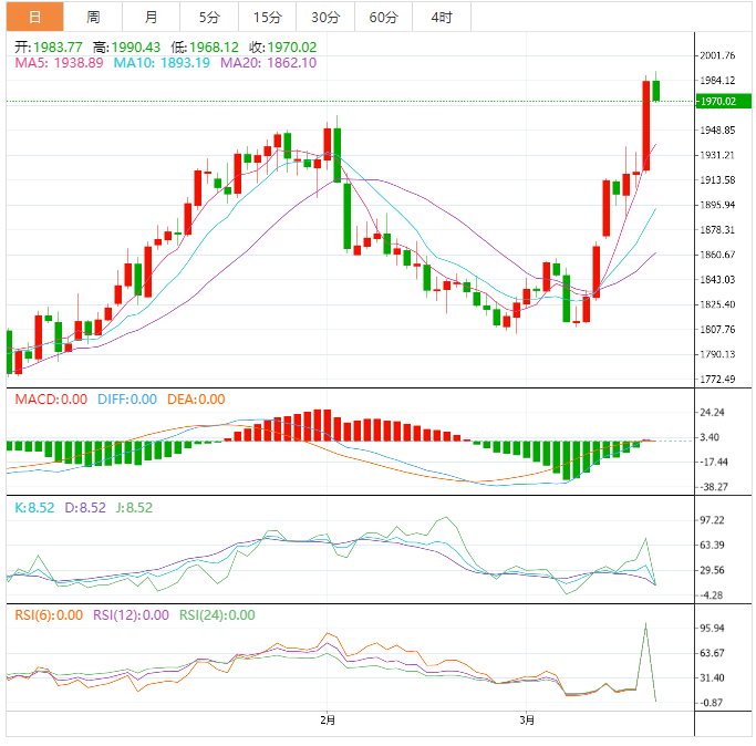 周一亚洲时段,黄金交投于1969.97附近。金价上周五大涨超过2%,且创下三年来最大周线涨幅,一轮银行业危机震撼全球市场,且对美联储将在对抗通胀方面不那么激进的押注也得到巩固。现货金攀升2.8%,至每盎司1971.95美元,为2022年4月以来最高。上周现货金已经上涨约5.6%,为2020年3月以来最大周线涨幅。