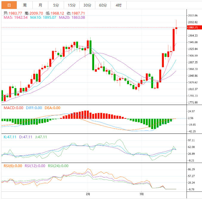 在全球银行业危机蔓延的担忧持续存在之际,避险需求推动金价上涨。周一目前,现货黄金的交易价格为每盎司2007美元,当天上涨了近1%。它正处于短期上升趋势,未来还会有更多的上升空间。