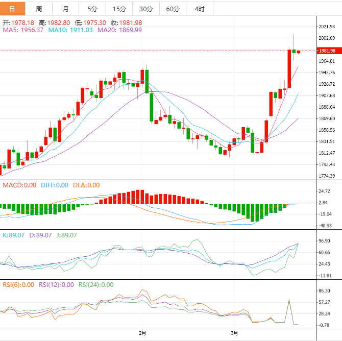 周二亚洲时段,现货黄金窄幅震荡,目前交投于1980美元/盎司附近,隔夜金价冲高回落,鉴于欧美银行业的动荡,金价一度创近一年新高至2009.70附近,但随着市场消化瑞银收购瑞士信贷的消息和美联储等六大央行的联合行动,市场避险情绪回落,美国股市和美债收益率反弹,金价回吐涨幅,收报至1978.80附近。