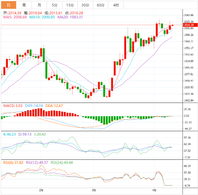 20期指数移动平均线(EMA)为2,014.48美元,为黄金多头提供了缓冲。