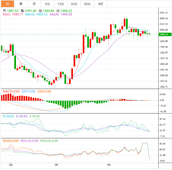 20期指数移动平均线(EMA)在1988.82美元附近持续徘徊,暗示将出现横盘走势。