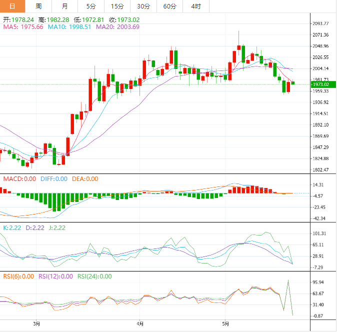 金价已回升至潜在阻力位上方,该阻力位已从4月19日低点1,969.26美元转为支撑位。在反应迅速的买家出现之际,金价从1950.00美元左右出现v型反弹。