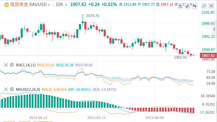 周三(6月28日),欧美一众央行行长在欧洲央行会议上就有关加息一事继续鹰派发言,令现货黄金负重下行,当日跌幅0.33%,收盘于1906.88美元,盘中最低一度逼近1900美元大关。