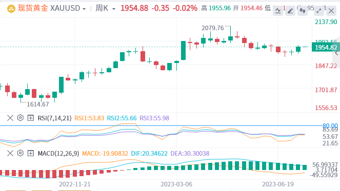 上周五(7月14日)由于美元有所反弹,现货黄金当日略回落0.28%,收盘在1954.70美元/盎司水平。就整体而言,上周黄金已创下4个月以来最好的单周表现,周升幅达到1.55%(升幅近30个美元)。