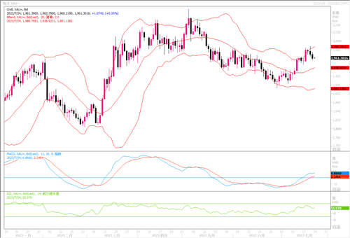 上周五(7月21日),现货黄金价格下跌,美市尾盘,现货黄金收报1961.44美元/盎司,下跌7.78美元或0.40%,日内最高触及1973.80美元/盎司,最低触及1956.61美元/盎司。