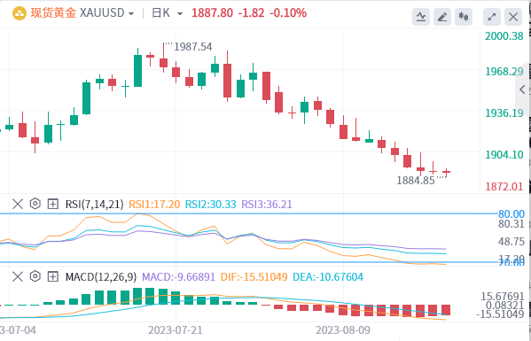 技术层面上,黄金自去年12月以来首次收于200日移动均线(SMA)下方,反映了卖方的主导地位。下行方向,1880美元(静态水平)是临时支撑位,如失守将跌向1850美元(2022年11月至2023年5月上行趋势的50%斐波那契回撤位)。若日线收盘价低于后者,则可能开启进一步跌向1800美元大关的大门。但如果黄金出现超卖状况,卖家可能会犹豫。如果金价回升至1900美元(200日移动均线,38.2%的斐波那契回撤位,心理水平)上方,并开始使用该水平作为支撑,有可能为进一步的回升铺平道路。在这种情况下,金价将有望升向1925美元(20日移动均线和50日移动均线)和1950美元(23.6%的斐波那契回撤位)阻力位。