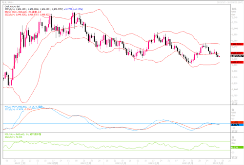 周三(9月132日),由于美国8月份通胀率增长仍略超预期,美联储11月份加息押注有所上升,导致现货黄金继续低行,盘中最低抵达1907.30美元,最后收盘于1913.19美元,全日下跌了0.46%。