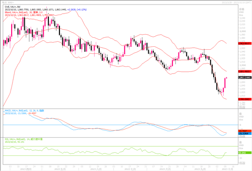 周一(10月9日),美联储官员发表鸽派言论,这打压美元走势,并令金价受到提振,当日升幅达1.54%,收盘于1860.85美元,盘中最高触及1863.46美元。