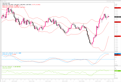 技术图形上来观察,4小时图上,MACD信号线死叉向下,短线有偏空倾向。在日线图之中,随机指标死叉向下,但是MACD指标暂时没有形成死叉闭口,但有超买之嫌,虽不至于有暴跌的可能性,但似乎也暂时失去冲高的劲头。虽然金价仍处在布林带通道中轨线上方,但自10月30日上升略突破2000关口之后,近一周以来金价一直未能进一步有效突破2000美元大关,须小心谨慎防范久攻不下转头下行的整理风险。下方继续留意上周提到过的初步支撑区域1965-1970美元。这个区域失守,整理性回落将进一步考验1950、1930这些价格的支撑。上方只有企稳2000美元之上,或许才能显现进一步上攻高位的趋向。