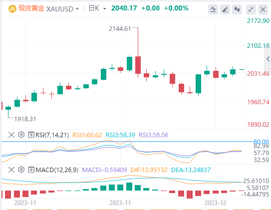 目前黄金价格正在努力寻找方向,进一步上涨似乎静待东风。随着2024年3次降息的预期加深,以及通胀率迈向2%的重大进展,美元开启下跌趋势,贵金属预计将继续获利。美联储政策制定者将最近金价的上涨描述为“夸大”,理由是央行正在关注货币政策还能持续多久,应保持紧缩政策以实现价格稳定,而不是目前降低借贷利率。目前黄金处于持稳平衡状态,等待下一个重要的经济基本面数据或消息。如果本周接下来的宏观数据尤其是反映通胀方面的数据继续显下降,将进一步支持美联储明年可能更激进地降息的观点。