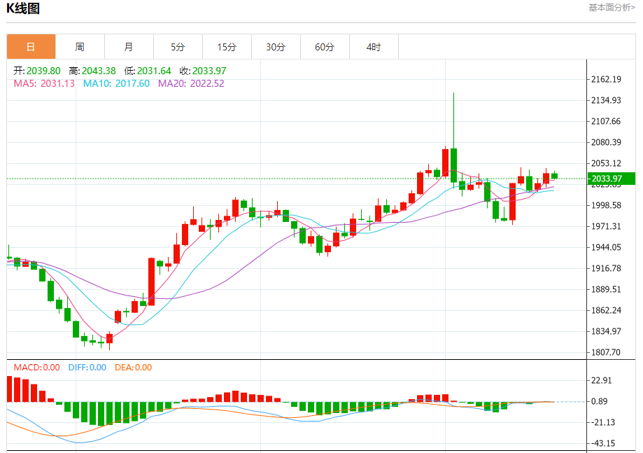 周三盘中,现货黄金报2032.42,跌幅0.37%。