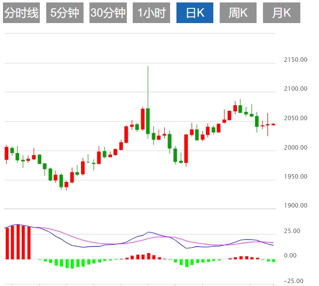 周四(1月4日),在美国就业数据乐观之后,基准10年期美国国债收益率上涨超过 1%,这使得黄金价格无法积聚看涨势头。在升至 2050美元/盎司上方后,现货黄金价格小幅走低至2036美元/盎司附近,并回吐了前几个交易日的涨幅,最终在收盘时回升至2040区间,收报2043.42美元/盎司,涨幅0.09%。