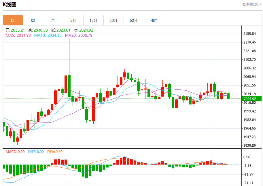 周四盘中,现货黄金报2024.98,跌幅0.48%。