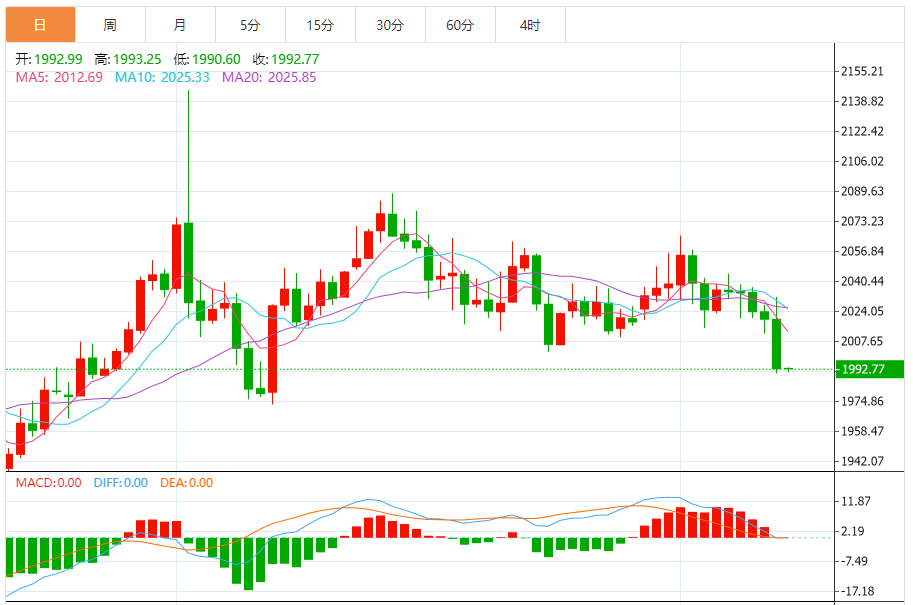 现货黄金周二收盘暴跌26.93美元,跌幅1.33%,收报1992.97美元/盎司,盘中最低触及1990.06美元/盎司。