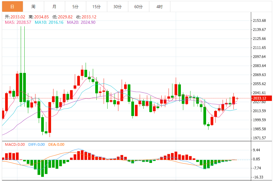 综合来看,黄金日内操作思路上建议上方短期重点关注2040-2045一线阻力,下方短期重点关注2020-2015一线支撑。