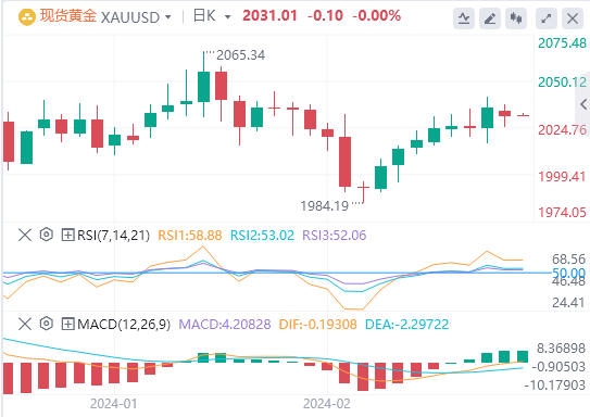 因美国较早降息可能性降低,现货黄金走势呈震荡下跌,于2025关口获支撑反弹,截至目前,黄金报价2031.01。