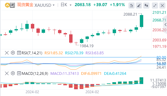 金价周五升至两个月最高,3月开局积极,此前低迷的经济数据使人们对美国在6月前降息的预期更加坚定。现货金上涨2.1%,至每盎司2086.21美元,为12月底以来最高,周线势将连续第二周上涨。美国期金GCcv1收高约2%,结算价报2095.7美元。数据公布后,指标美国10年期公债收益率US10YT=RR和美元指数DXY下跌,这增加了黄金的吸引力。