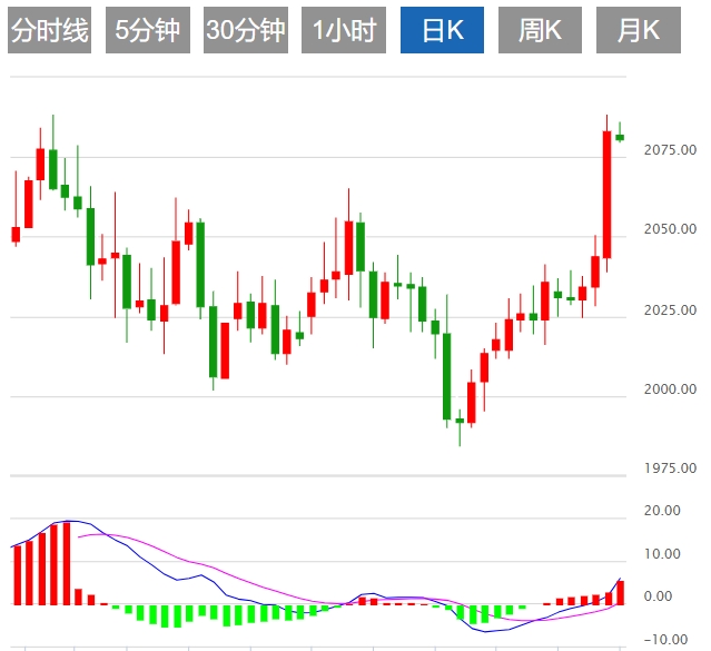 短期阻力目前在数月高点2088--2089美元附近,突破该位金价将测试2100美元。若买入动能增强,金价不排除将测试历史高点2144美元的可能性。