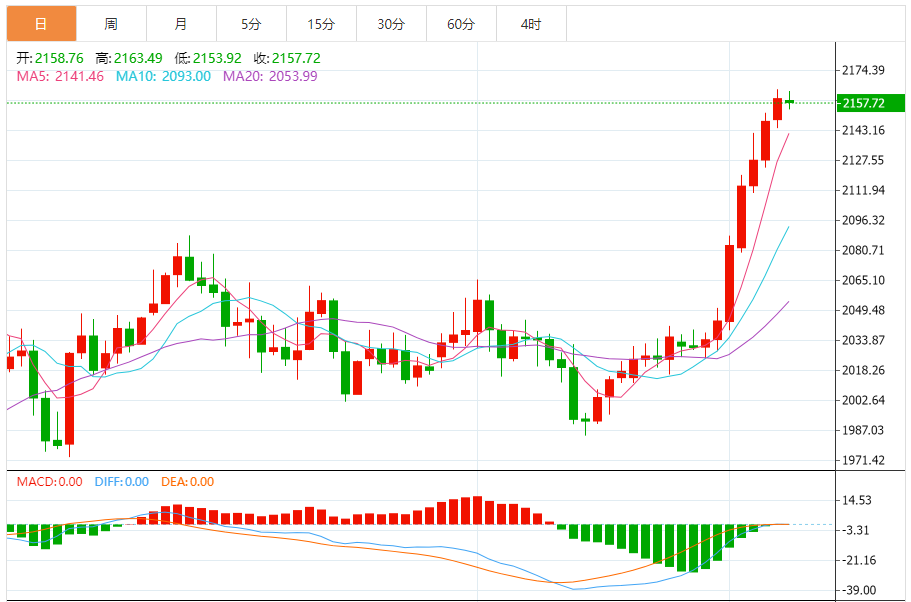 从日线级别:黄金日线结构连续6连阳,连续4个交易日强势拉升,如此极端的上涨状态明确了其中长线看涨的预期,但是也因为短线的拉升幅度过大,且对基本面预期提前做出反应,中线的空间被透支很大一部分,这反倒给实际操作上带来不小的难度。目前黄金虽然表现强势,但日线级别以及周线级别指标上,都已经出现明显的超买信号,且黄金近期的运行节奏又与整个市场都呈现脱节的状态,这使得短线走势很难做常规的技术趋势预判。按照技术结构中长线趋势来看,上方历史高点连线形成的趋势线压力在2178附近,这可能成为本波黄金极端拉升的关键技术强压。