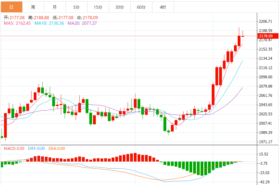 现货黄金上周五收盘大涨19.38美元,涨幅0.9%,收报2178.95美元/盎司,金价盘中最高触及2195.07美元/盎司。