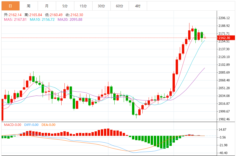 现货黄金周四收盘重挫12.28美元,跌幅0.57%,收报2161.99美元/盎司。