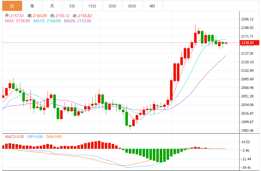 周三(3月20日),现货黄金维持日内温和反弹走势,目前金价位于2160美元/盎司附近。投资者以谨慎的态度等待美联储的货币政策声明。短期内金价上行空间有限。