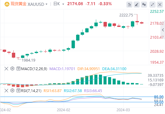 周四,因鲍威尔暗示将在2024年进行三次降息,现货黄金刷新历史新高,一度站上2220关口,但因美元指数持续走强,现货黄金于美盘回吐全部涨幅,最终收跌0.24%,报2180.50美元/盎司;截至目前,黄金报价2174.08。
