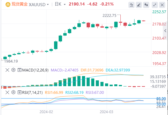 现货黄金再次于欧盘时段猛然拉升,重回2190关口上方,最终收涨0.73%,报2194.86美元/盎司;截至目前,黄金报价2190.14。