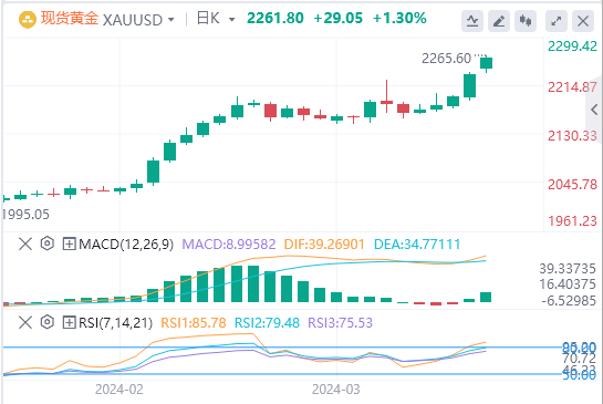 金价巩固了最近的升势,创下2260美元的历史新高,为复活节周一和2024年第二季度拉开了积极的序幕。复活节假期延长导致流动性稀缺,在美元普遍低迷的情况下助长了金价的升势。
