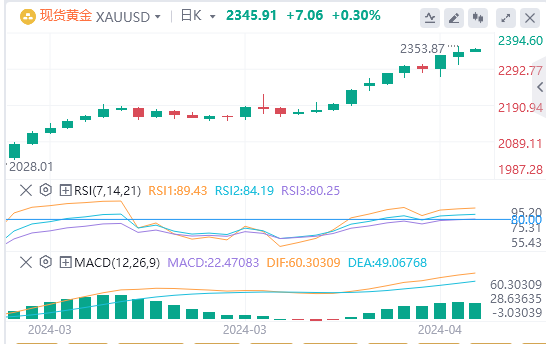 4月9日,周二欧市盘中,黄金稳定在2345美元上方,在经济信号波动和全球紧张局势中,勉强从略低于2350美元的峰值移动。这一走势代表了0.26%的小幅增长,表明交易员的谨慎乐观。