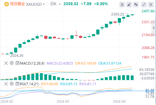 4月10日,周三欧市早盘,金价在2350美元附近徘徊,低于一天前创下的2365美元历史新高。在当天晚些时候美国经济活动密集之前,黄金交易商已转而观望。
