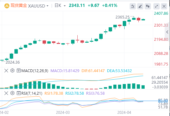 4月11日,周四欧市盘前,黄金出现了一些卖盘,并从前一天触及的历史高位回落,原因是美国消费者通胀数据升温,削弱了市场对美联储(FED)即将降息的希望。然而,贵金属在盘中跌至2319美元附近时止跌回升,并在周四亚洲时段股市普遍走弱的背景下重新获得了一些积极的牵引力。