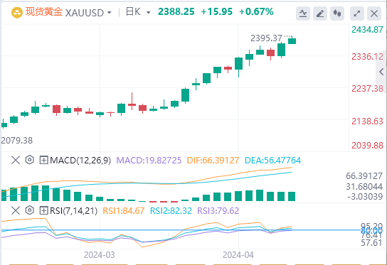 随着美国3月PPI数据提振了市场对美联储降息的押注,且持续的地缘政治担忧也增添了避险需求,现货黄金突破2370美元/盎司关口,将纪录新高刷新至2377美元/盎司,最终收涨1.66%,报2372.47美元/盎司;截至目前,黄金报价2388.25。