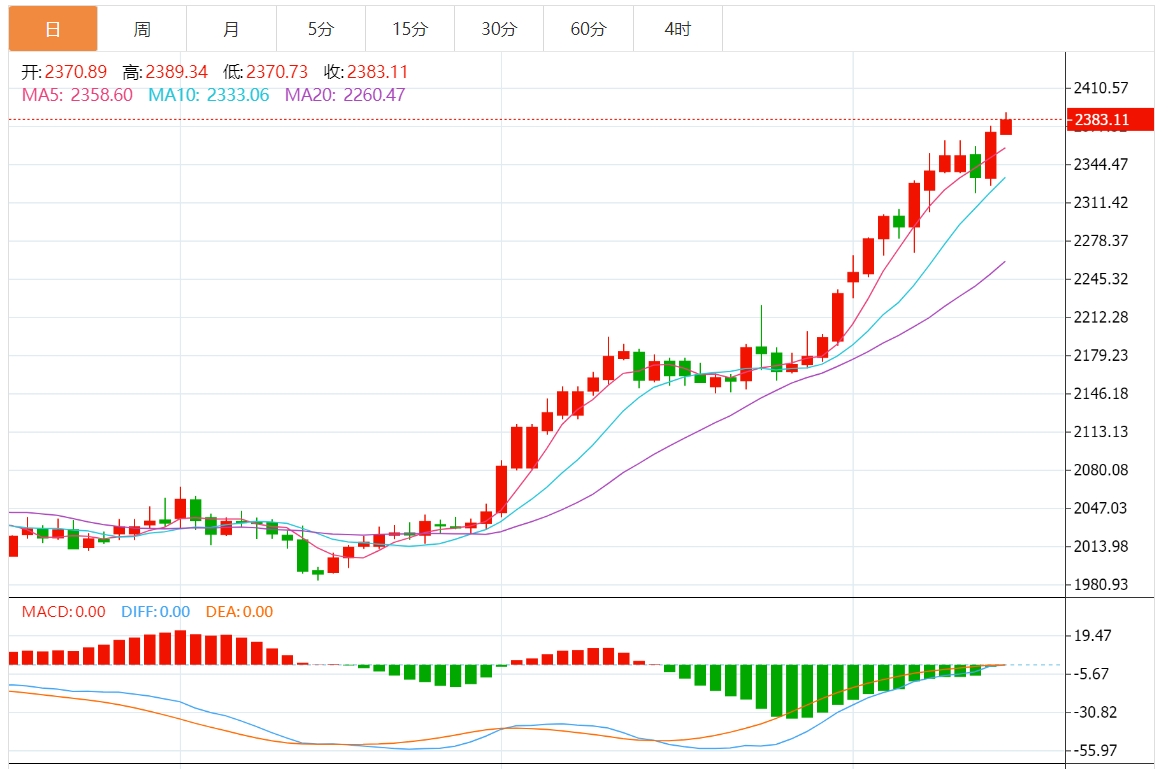 技术上,相对强弱指数从80附近向下修正。下行时的初始支撑位位于从2319美元低点至2395美元高点的23.6%斐波那契回撤位2378美元附近。