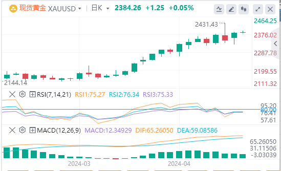 伊朗对以色列发动前所未有的袭击引发人们对中东紧张局势升级的担忧,现货黄金跳空高开,美盘站上2380美元/盎可,较日低反弹超50美元,最终收涨1.66%,报2383.19美元/盎司;截至目前,黄金报价2384.26。