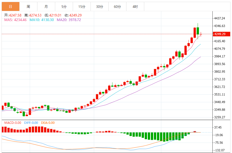 国际现货黄金创下4379美元的历史新高后跳水近130美元,最终收跌1.75%,截至目前,黄金报价4243.39。