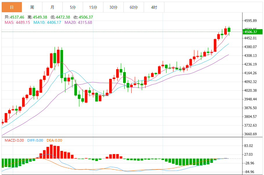 上周收盘较高,报4533.21美元,上涨194.45美元,涨幅+4.48%。此次涨势标志着前主顶线在4381.44美元清扫。市场创历史新高,没有阻力。