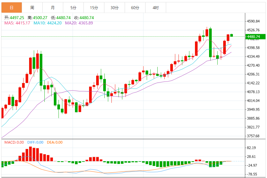 ÔÚÈÕÏßͼÖУ¬¼òµ¥Òƶ¯Æ½¾ùÏߣ¨SMA£©³Ê¿´ÕÇÅÅÁУ¬21ÈÕ¾ùÏßλÓÚ50ÈÕ¡¢100ÈÕºÍ200ÈÕ¾ùÏßÖ®ÉÏ£¬ÇÒËùÓоùÏßµÄбÂʾùΪÉÏÉý¡£ ¼Û¸ñ±£³ÖÔÚÕâЩ¾ùÏßÖ®ÉÏ£¬±£³Ö¶ÌÆÚÆ«Ïò»ý¼«£¬21ÈÕ¾ùÏßÔÚ4334.85ÃÀÔª¸½½üÌṩ¶¯Ì¬Ö§³Å¡£ Ïà¶ÔÇ¿ÈõÖ¸Êý£¨RSI£©£¨14£©Îª60.29£¬ÈÔ¸ßÓÚÖÐÏߣ¬±íÃ÷ÂòÈ붯ÄÜÇ¿¾¢¡£