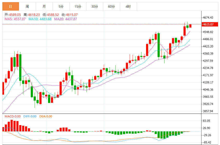 技术上,21期简单移动平均线(SMA)已上穿50期SMA,且两者均向上倾斜,强化了当前的上升趋势。价格走势仍轻松高于关键移动平均线,21期SMA位于约4,534.94美元,构成第一层动态支撑,其次是50期SMA约4,468.91美元。