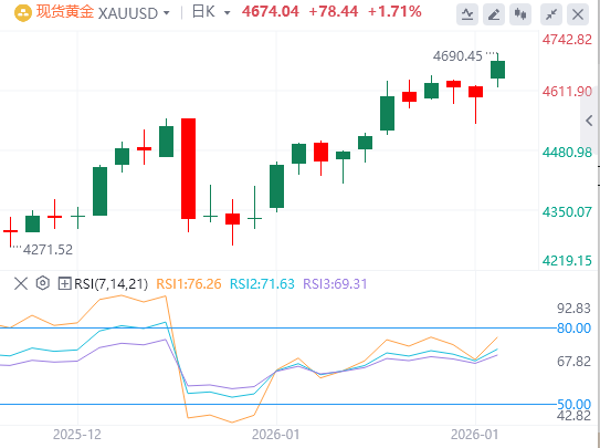 1月19日,黄金在新一周开始时遭遇激烈买卖,并在全球寻求安全之潮中,亚洲交易时段跳升至4700美元附近,创下历史新高。美国总统唐纳德·特朗普威胁要对反对他收购格陵兰计划的八个欧洲国家征收新关税。这一宣布引发了欧洲官员的批评,并引发了对更广泛跨大西洋贸易争端的担忧。这在地缘政治风险加剧的基础上,引发了新一轮全球风险规避交易浪潮,促使投资者寻求传统避险商品的庇护。