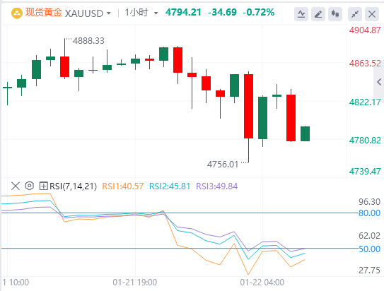 1月22日,黄金价格在周四亚洲早盘时段内收减至接近4795美元。在美国总统唐纳德·特朗普放弃欧洲关税威胁并宣布格陵兰框架协议后,贵金属从创纪录的4888美元高点回落。