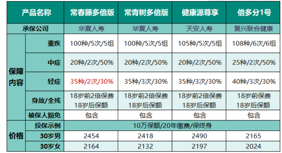 常春藤多倍版和同一家的常青树多倍版非常相似,但轻症赔付次数偏弱,价格偏高,条款也不如对方,完全输给了自己人。